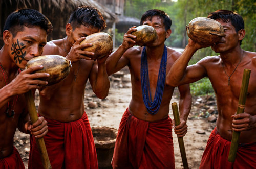 Technologická odbočka: alkohol vyrábíme dvěma způsoby. Tradičně přírodním kvašením a průmyslově pak synteticky. Syntetický alkohol se v potravinářství používat nesmí, (ale běžte to vysvětlovat do chudé ruské vesnice). Věnujme se proto variantě potravinářské. Víte, co pijí Indiáni na obrázku? Raději to snad ani vědět nechtějte. Přírodní kmeny vyráběly a dodnes vyrábějí alkohol tak, že ženy rozžvýkají něco, co bude kvasit, ať už ovoce, nebo palmovou dřeň. Žvýkají a plivou směs do kádě, kde pak nevábný obsah kvasí a pije se při domorodých slavnostech. Toto je skutečně tradiční výroba alkoholu a věřím, že většina současných Čechů dá jednoznačně přednost čemukoli jinému. Vývojově pokročilejší společnosti vyráběly a vyrábějí celou řadu alkoholických nápojů, přičemž mezi ty opravdu starověké patří pivo a víno. To jsou nápoje s nižším obsahem alkoholu, který vznikl přírodním kvašením Víno může obsahovat maximálně čtrnáct procent lihu, protože vyšší koncentrace už kvasinky zabíjí. (Portské má přes dvacet procent proto, že se do něj přidává brandy.) Rozlišujeme tedy přírodně kvašené alkoholické nápoje a destiláty. Nápoje s vyšší koncentrací se vyrábí zejména destilací, méně tradičně pak vymrazováním zkvašeného produktu. A nyní se pojďme podívat na důležitou věc a tou je metabolizace a kvalita alkoholu.